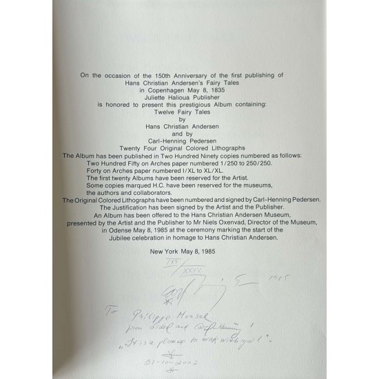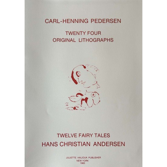 Carl-Henning Pedersen, H C Andersens Eventyr. Komplet serie med tekstark og 24 originale farvelitografier, der alle er enkeltvis håndsigneret og nummereret med romertal. I den originale lærredsbetrukne kassette . Motivernes størrelse varierer, men de er alle trykt på fornemt fransk Arches papir format 76 x 56 cm med brede margener. Litografierne har aldrig været indrammet, så de er alle i perfekt stand. Det første foto viser selve kassetten og et af de originale litografier
