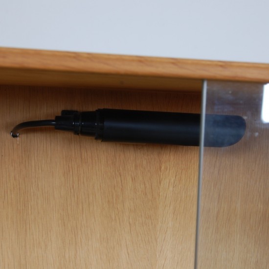 Mogens Koch skab af ege træ, med låger og hylder af glas, samt med en lampe indvendigt. Skabet er fra 70'erne og fremstår i god stand med nogle mærker, ridser og et brud på siden.