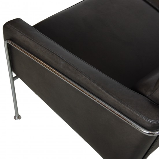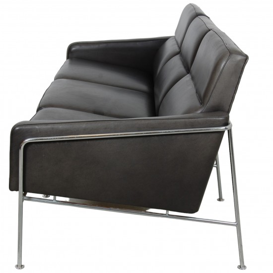 Arne Jacobsen 3-personers lufthavns sofa model 3303 betrukket med sort anilin læder. Sofaen er fra omkring 1980'erne, men blev for ca. 10 år siden ombetrukket med nyt læder og skum. Sofaen fremstår med flot patineret læder.