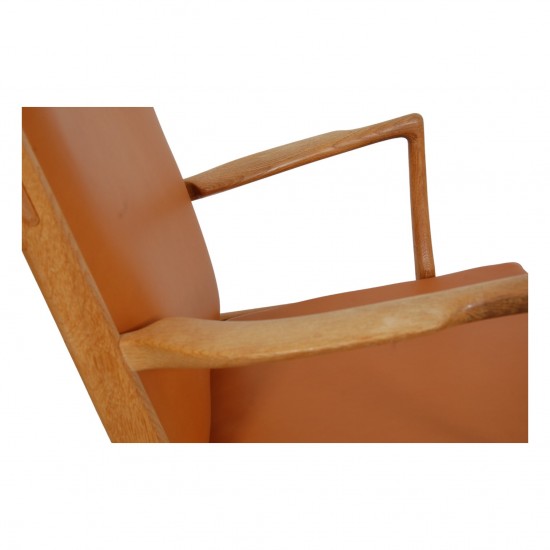 Hans Wegner AP-16 lænestol med stel af massiv eg, og med betrukket sæde og ryg i cognac farvet anilin læder. Stolen er fra omkring 80'erne, og fremstår ny betrukket i læder. Stolen fremstår i super stand, med let patineret stel.