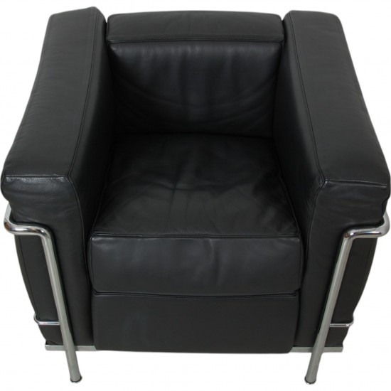 Le Corbusier LC 2/1 lænestol betrukket med originalt sort læder og med et chrome stel. Stolene er fra omkring år 2008 og fremstår i flot stand med flot patineret læder. Alle stole stammer fra samme sted, og fremstår i samme gode stand