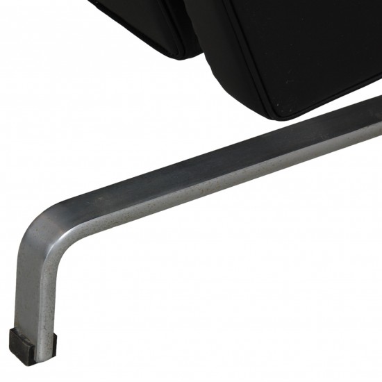 Poul Kjærholm lænestol model PK-31/1 betrukket med sort anilin læder, og med stel af stål. Stolen er fra omkring 1970, men fremstår ny betrukket med læder og nye hynder. Stellet fremstår med let rust.