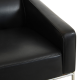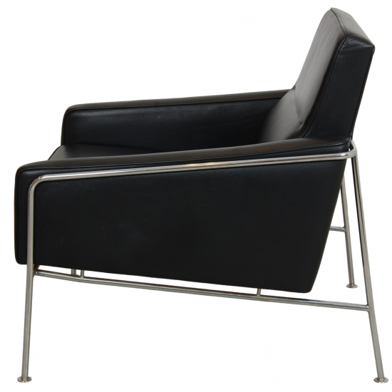 Arne Jacobsen Lufthavnsstol model 3301, betrukket med patineret sort læder. Stolen er fra 1982, men er dog blevet ombetrukket senere hen formodentligt omkring år 2000. Læderet fremstår med flot patina.