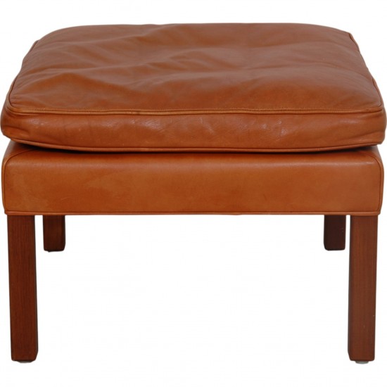 Børge Mogensens Øreklapstol, model 2204, betrukket med originalt cognac farvet læder og med ben af teak. Stolen er fra 1980'erne og fremstår i god stand, dog med patineret læder og med lette mærker på benene. Stolen fremstår med dunhynder og medfølger en skammel.