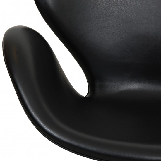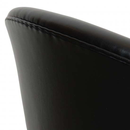 Arne Jacobsen lav Svane stol, betrukket med sort Classic læder, og med en stjernefod af aluminium. Stolen er fra 1960'erne, men er blevet ompolstret med nyt skum og læder, og fremstår i pæn stand, dog med let rust, ridser, og mærker på foden.