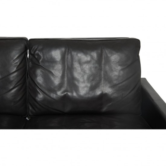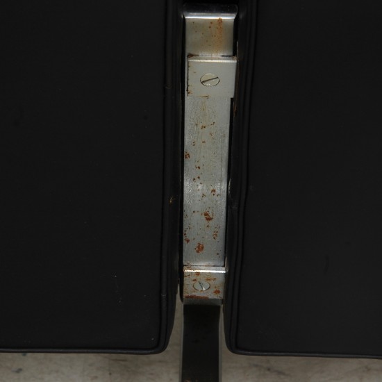 Poul Kjærholm 3.personers PK31 sofa betrukket med sort læder og med stel af kromet fjederstål. Sofaen er fra omkring 1970'erne og fremstår i pæn stand, dog med patineret læder og med let rust på stellet. Hynderne er blevet ompolstret for omkring 10 år siden. Fremstår med huller i stuffet under sæde hynderne.
