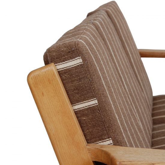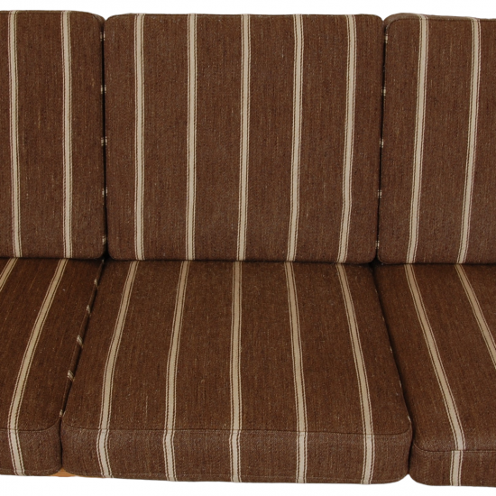 Hans Wegner ge-290 3.pers sofa med stel af massiv ege træ, og med hynder betrukket brunt og hvidt hestedækken stof. Sofaen er fra omkring år 90'erne og fremstår med de originale springhynder. Sofaen fremstår i flot stand dog med let slid på sædehynderne
