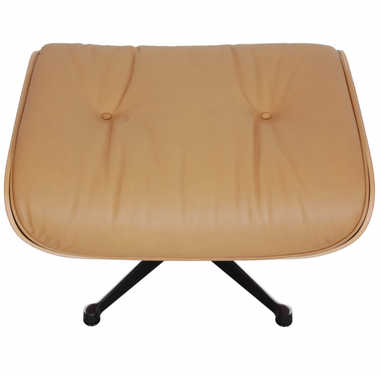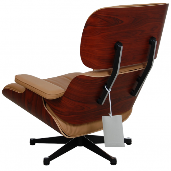Charles Eames Lounge chair with ottoman in caramel-colored leather, and with a back of rosewood. The chair is new and has never been in use, the chair comes in the original packaging, and with all documents from Vitra. New dimensions