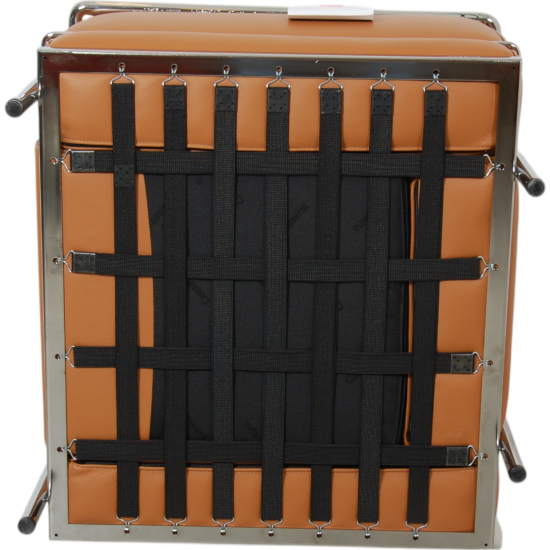 Ny stol betrukket med originalt cognac farvet læder og med et chrome stel. Stolen fremstår som ny og har aldrig været brugt.