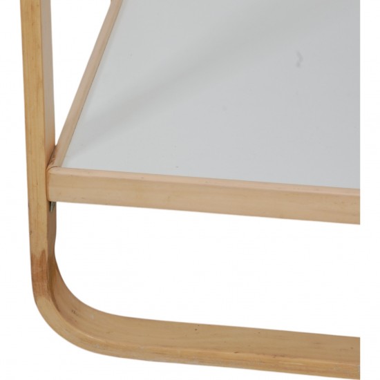 Serving table model 901, designed by Alvar Alto in the 1980s. The table is in white with a frame of beech, and it appears in good condition but with marks and scratches and a damaged corner. The table has two wheels on the sides.