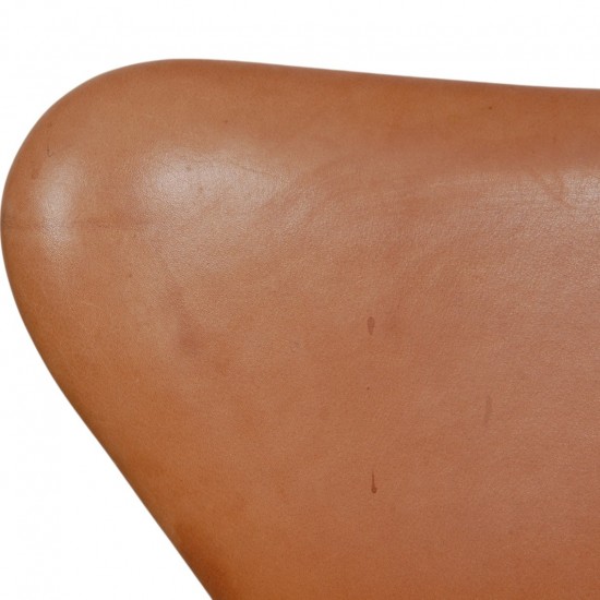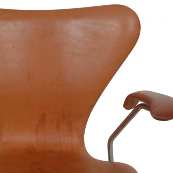 Arne Jacobsen Seven 3207 armchair upholstered in cognac anilin leather, and with a chrome frame. The chair is from 1989 but was later reupholstered in the current leather around 20 years ago. The chair appears with patina on the leather and with some marks and rust on the frame. The chair has a firm back.