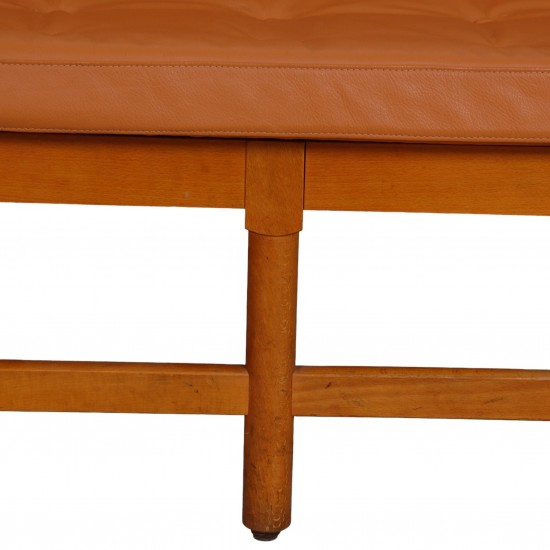 Børge Mogensen 2.seater Spoke-back sofa with a beech frame and cognac leather cushions. The sofa is from 1963 and appears with a heavy patina on the frame, with marks and scratches. The cushions were later replaced around 20 years ago and appear with patina.