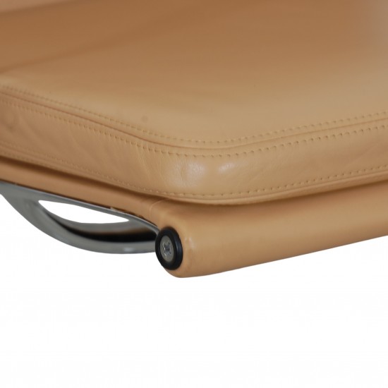 Charles Eames chair model EA-208 fully upholstered in light leather, and with a chrome frame and armrest. The chair is from 2003 and appears in great condition, but with a few marks on the edges. Mulitple chairs are in stock, all chairs originate from the same place, and appear in the same condition.