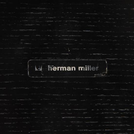 This Charles Eames Lounge chair with ottoman is upholstered in black leather and with a shell off black painted wood. The chair is from the 1980s and appears in good condition but with patinated leather and with a veneer damage on the chair and a few minor scratches on the leather. The ottoman is missing a clip underneath the seat.