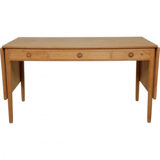 Hans Wegner AT-305 desk of veneered oiled oak with 3 drawers and two extension flaps. The table is from the 1970s but has recently been refurbished but does appear with a stain on the table top.