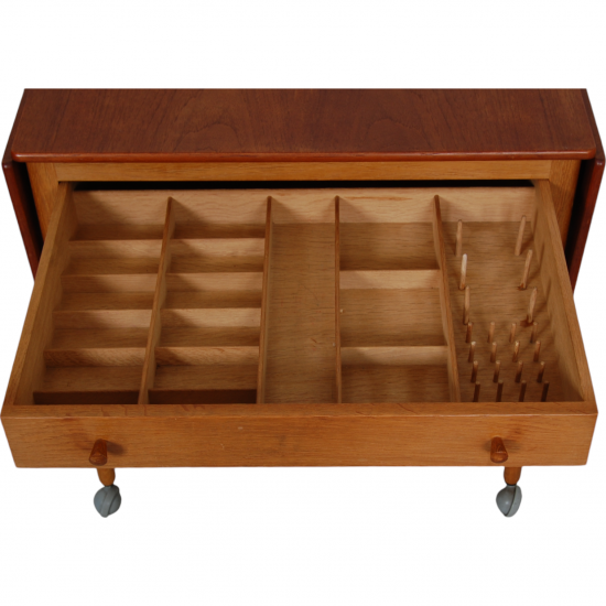 •Condition: Second-hand Hans Wegner sewingtable with wheels of teak and oak.